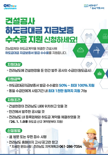 [파이낸셜경제=김예빈 기자] 전라남도가 건설산업 활력을 높이고 하도급 업체 보호를 위해 ‘2026년 건설공사 하도급대금 지급보증 수수료 지원사업’을 확대 추진한다.