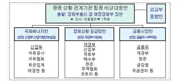 정부는 경제부총리를 중심으로 중동 상황 관련 실물경제, 에너지, 금융시장, 중동 동향 등에 대한 관계기관 합동 비상대응반을 가동하고 중동 현지 상황과 국내외 금융시장, 에너지·수출·해운·항공·공급망 등 실물경제 영향을 24시간 모니터링해 나갈 계획이다. 아울러, 이상징후 발생 시 준비된 상황별 대응계획(Contingency plan)에 따라 관계기관 간 공조 하에 신속하게 대응해 나갈 계획이다.