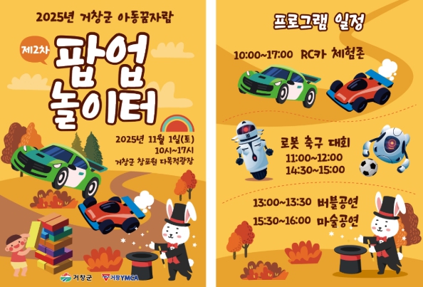 [파이낸셜경제=김예빈 기자] 거창군은 오는 11월 1일, 오전 10시부터 오후 5시까지 남상면 창포원에서 ‘아동꿈자람 팝업놀이터’ 행사를 운영할 예정이다. 이번 행사는 지난 7월 수승대 잔디광장에서 열린 행사에 이어 두 번째로 마련된 것으로, 거창군 국화축제 기간 중 열리며 아이들이 자유롭고 안전하게 즐길 수 있는 체험형 놀이공간을 제공한다.