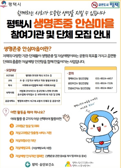 '생명존중 안심마을' 사업에 참여를 희망하는 기관이나 단체는 평택시 정신건강복지센터로 문의하면 된다.