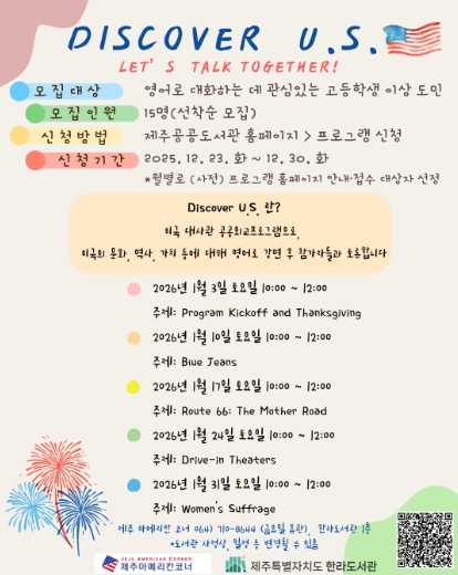 [파이낸셜경제=김영란 기자] 제주특별자치도 한라도서관은 주한미국대사관과 협력해 도민의 글로벌 이해와 영어 활용 역량 강화를 위한 교육 프로그램 ‘Discover U.S.’를 올해부터 운영한다고 밝혔다.