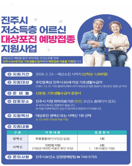진주시 관계자는 “이번 사업을 통해 취약계층 어르신들의 대상포진 발병을 예방하고, 만성 통증과 각종 합병증을 줄여 건강한 노후생활을 지원하는 데 많은 도움이 되기를 바란다”고 말했다.