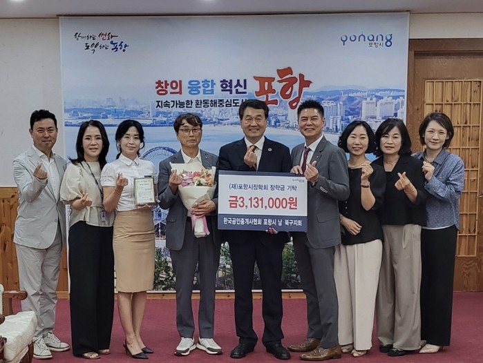 [파이낸셜경제=김지훈 기자] 한국공인중개사협회 경상북도지부 포항시 남·북구지회는 18일 포항시 장학회에 장학금 3,131,000원을 기탁하며 지역 인재 육성에 힘을 보탰다.