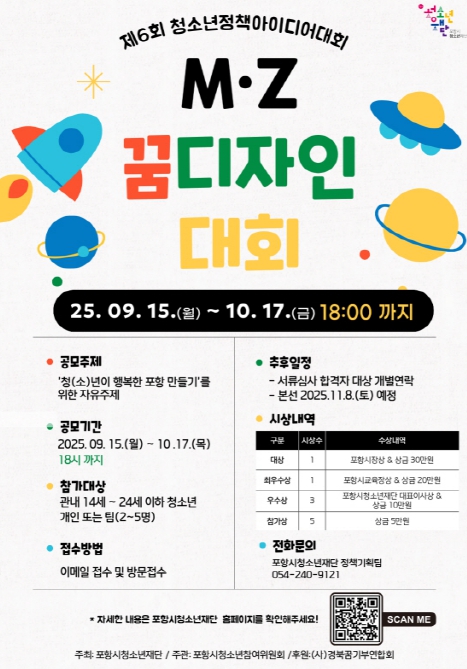 [파이낸셜경제=김지훈 기자] 포항시청소년재단은 ‘청(소)년이 행복한 포항 만들기’를 주제로 청소년이 직접 청소년 관련 정책을 제안하는 ‘M·Z 꿈 디자인대회’를 개최한다.