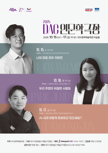 [파이낸셜경제=김지훈 기자] (재)대구문화예술진흥원 문화예술회관은 인문학으로 시민들의 문화적 정서 함양과 인간다운 삶의 가치를 제공하기 위한 공개 강연인 2025 DAC 인문학극장을 오는 10월 15일부터 17일까지 오후 7시 30분 3일간 대구문화예술회관 비슬홀에서 개최한다.