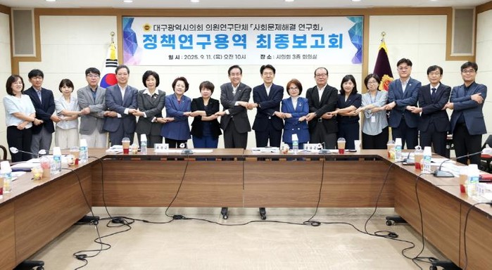 [파이낸셜경제=김지훈 기자] 대구광역시의회 의원연구단체인 ‘사회문제해결 연구회’는 9월 11일 오전 10시 시의회 3층 회의실에서 정책연구용역 2건에 대한 최종 보고회를 개최했다.