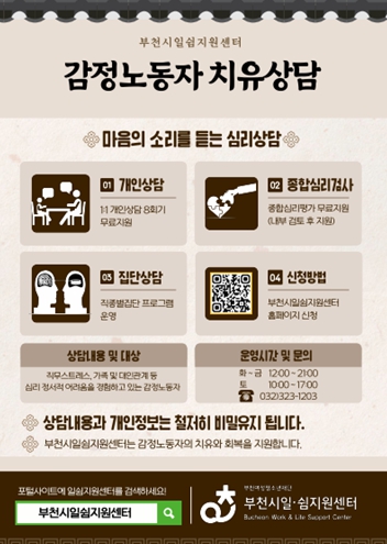 부천시일쉼지원센터 치유상담실은 전문가 상담을 통해 감정노동자의 직무 스트레스, 성격, 대인관계, 가족관계, 정신건강 등 다양한 어려움에 대한 문제 해결과 일상 회복을 지원한다.