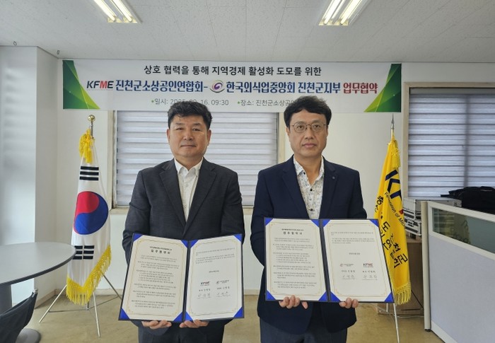[파이낸셜경제=김기보 기자] 충북 진천군소상공인연합회(회장 안원희)와 (사)한국외식업중앙회 진천군지부(지부장 신창옥)는 16일 연합회 사무소에서 관내 소상공인과 외식업계의 상생 발전을 위한 업무협약(MOU)을 체결했다.