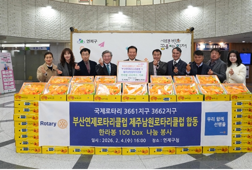 [파이낸셜경제=박영진 기자] 연제구는 지난 2월 4일 부산연제로타리클럽(회장 한지호)과 제주남원로타리클럽(회장 현윤완)으로부터 지역 사회복지시설 지원을 위한 한라봉 100박스(250만 원 상당)를 전달받았다.
