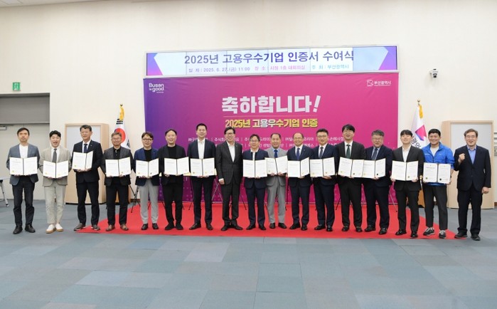 인증서 수여식은 27일 오전 11시 시청 대회의실에서 박형준 시장을 비롯한 고용우수기업 15개 사 대표 등 40여 명이 참석한 가운데 개최된다.