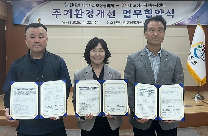 4월 22일 오전 11시, 현내면 행정복지센터 2층에서 고성군자원봉사센터와 함께 저장강박 등으로 주거환경 개선이 필요한 위기가구 지원을 위한 업무협약(MOU)을 체결했다.