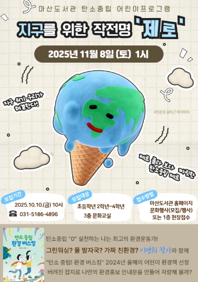 [파이낸셜경제=김기보 기자] 김포시 마산도서관에서 오는 11월 8일 오후 1시부터 3시까지, 초등학교 2학년~4학년 어린이를 대상으로 탄소중립 어린이 프로그램 책풍당당 '지구를 위한 작전명 ‘제로’'를 운영한다.