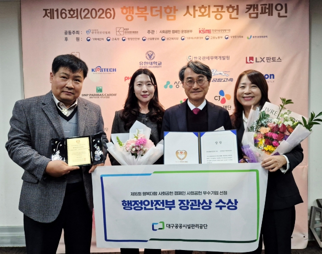 [파이낸셜경제=김지훈 기자] 대구공공시설관리공단이 지난 2월 26일 (사)한국언론인협회와 (사)한국경영자총협회가 공동 주최하는 ‘2026 행복더함 사회공헌 캠페인’에서 우수기업으로 선정되어 행정안전부 장관상을 수상했다.