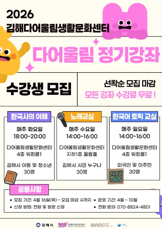 수강생 모집은 4월 16일부터 정원 마감 시까지 선착순으로 진행되며, 김해다어울림생활문화센터를 통해 신청할 수 있다.