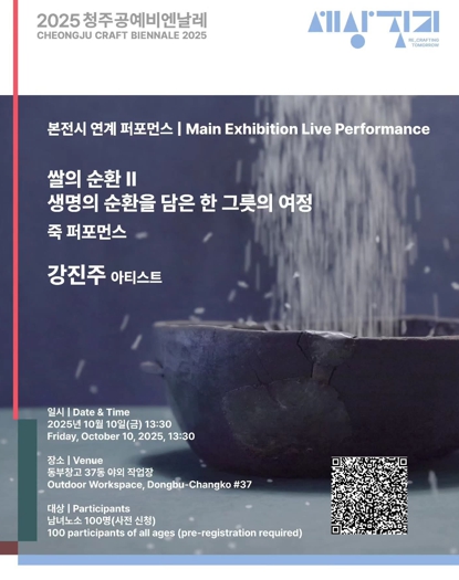 도예를 출발점으로 조각·설치·미디어 등 다채로운 장르를 넘나드는 이헌정과 함께하는 아티스트 토크는 오는 17일 오후 2시에 문화제조창 동부창고 38동에서 진행한다. 2025 청주공예비엔날레 준비한 마지막 국제공예워크숍의 자세한 일정 등은 홍보물을 참고하면 된다.