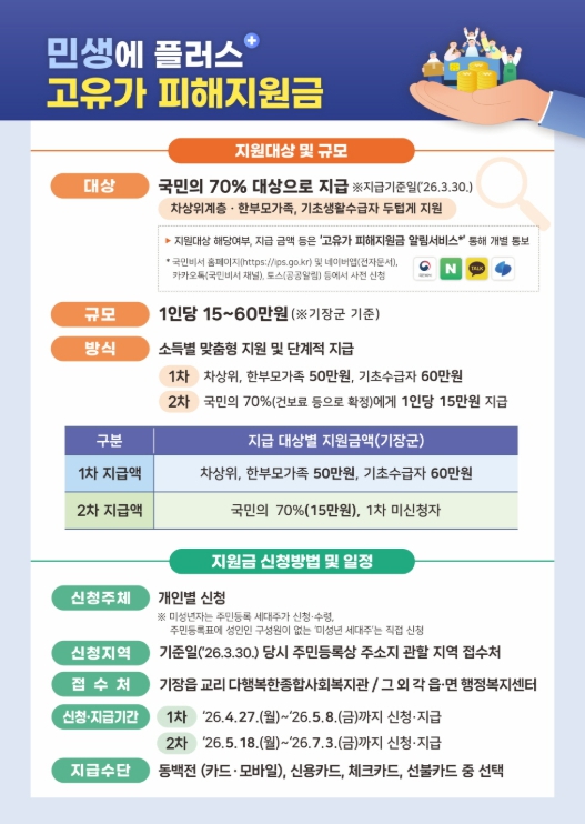 이번 지원 사업은 시급성을 고려해 대상별로 두 단계에 걸쳐 순차적으로 진행된다. 우선 1차로 취약계층을 지원하고, 이후 소득 기준 70% 이하 군민을 대상으로 2차 지급을 이어간다.