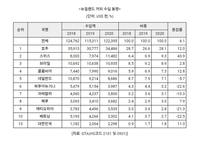 2020년 뉴질랜드로의 커피 수입규모는 1억2000만 달러로 1억1000만 달러를 기록한 전년 대비 6%가량 증가했다. 주요 수입국은 호주이며 3400만 달러로 2020년 전체 수입시장의 28%를 차지했다. 다음으로는 스위스와 브라질이 각각 1100만 달러(9%), 1000만 달러(8%)로 2위와 3위 교역국인 것으로 나타났다. 우리나라로부터 수입되는 커피류는 200만 달러로, 전체 교역국 중 13위로 2%의 시장점유율을 기록했다.