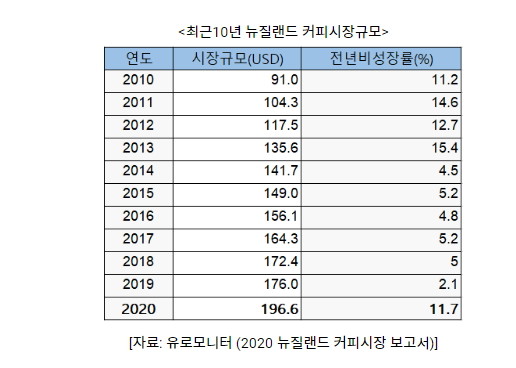 시장조사기관인 유로모니터에 따르면, 뉴질랜드 커피시장 규모는 2020년 판매량을 기준으로 1억9700만 달러인 것으로 나타났다. 이러한 판매는 전년 대비 11.7% 증가한 수치인데, 코로나19로 인해 식품 서비스업에서의 커피 소비는 22%(물량기준 1,400톤) 감소했지만, 가정에서 커피를 즐기는 소비자들이 늘면서 슈퍼마켓 등 소매업에서 판매되는 커피량은 12%(물량기준 6000톤) 증가한 것으로 나타났다.