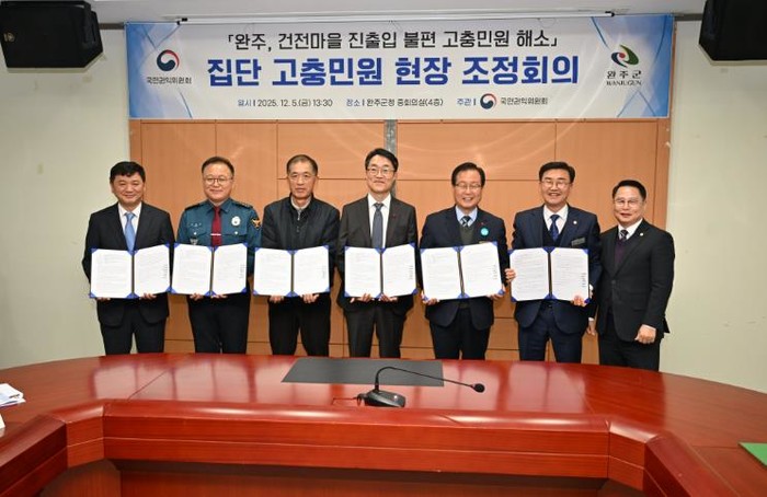 이날 협약식에는 유의식 의장, 성중기 위원장, 유희태 완주군수, 한삼석 국민권익위원회 부위원장, 조현익 전주국토관리사무소장, 박종호 완주경찰서장, 이호선 건전마을 주민(신청인) 등 20여 명이 참석했다.