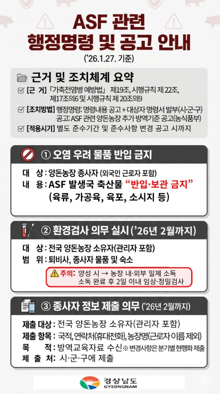 [파이낸셜경제=김예빈 기자] 경상남도는 전남 영광 종돈장에서 아프리카돼지열병(ASF)이 발생하는 등 전국적으로 확산 우려가 커짐에 따라, 도내 모든 양돈농장과 축산시설을 대상으로 고강도 방역 대책을 추진한다고 밝혔다.