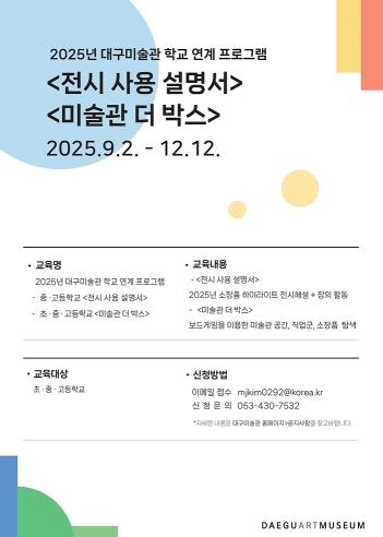 중·고등학생 대상의 진로체험 교육인 ‘전시 사용 설명서’는 대구미술관 소장품 하이라이트 전시를 작품 해설과 함께 감상하고, 다양한 미술관 직업군을 탐구한다. 또한 전시 기획자의 시각에서 직접 전시 주제를 선정하고 전시 공간을 구상해 보는 시간을 가진다. 이는 예술감상, 진로탐색, 창의적 문제 해결을 유기적으로 결합해, 학생들의 자기 주도적 학습 역량 제고를 돕는다.