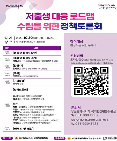 현재 진행 중인 연구는 내년도 부산시가 발표할 『제5차 부산광역시 저출산 종합계획(2026~2030년)』의 기초자료로 활용되기에, 관련 분야 전문가와 시민들의 참여 확대로 정책 공감대가 형성되어야 한다는 것이 복지환경위원회의 설명이다.