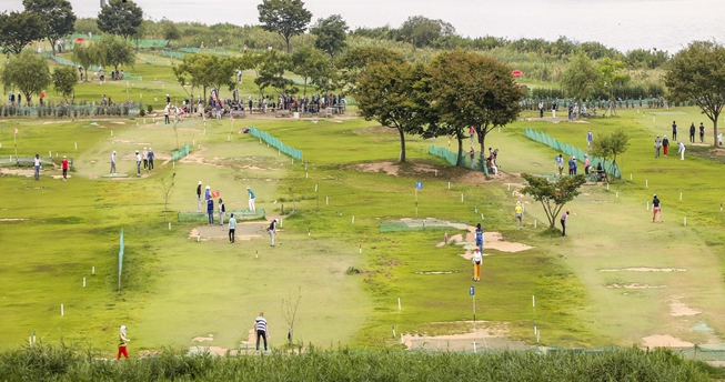| ▲ 45홀에서 90홀로 증설하여 개장한 대저생태공원에서 파크골프를 즐기는 주민들 모습 |