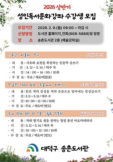 [파이낸셜경제=김영란 기자] 대전 대덕구 송촌도서관은 새봄을 맞아 오는 3월부터 성인을 대상으로 한 독서문화강좌를 운영한다.