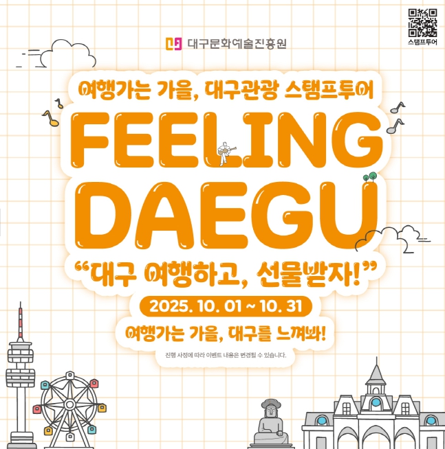 [파이낸셜경제=김지훈 기자] 대구광역시와 대구문예술진흥원관광본부는 문화체육관광부 ‘여행가는 가을’ 캠페인을 연계하여 10월 한 달간 대구를 방문하는 관광객 대상으로 스탬프투어 이벤트를 운영한다.