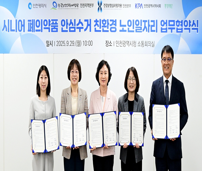 [파이낸셜경제=김기보 기자] 인천광역시는 9월 29일 시청 청사에서 건강보험심사평가원 인천본부, 인천시약사회, 환경재단, 한국노인인력개발원 인천본부와 함께‘폐의약품 안심분리수거 노인일자리 확대 업무협약’을 체결했다고 밝혔다.