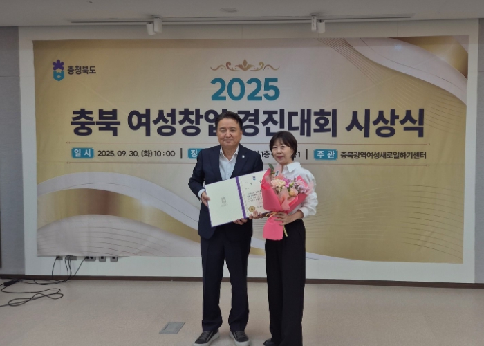 [파이낸셜경제=김기보 기자] 지난 9월 30일 충청북도의회 워크숍실에서 열린 ‘2025 충북 여성창업 경진대회’에서 제천여성새로일하기센터 지연옥씨(바닐라유닛/사용자 프로파일 기반 AI 지역정보 추천 플랫폼 ‘오늘의 제천’)가 우수상을 받았다.