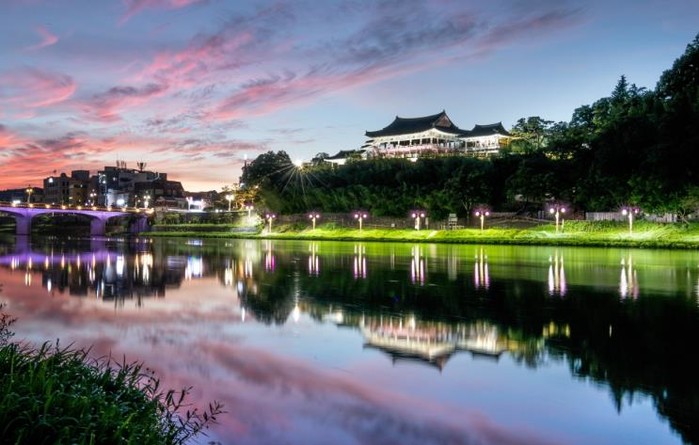 조명이 켜진 영남루는 밀양강 수면에 반사돼 마치 한 폭의 그림처럼 도시의 밤을 물들인다.
