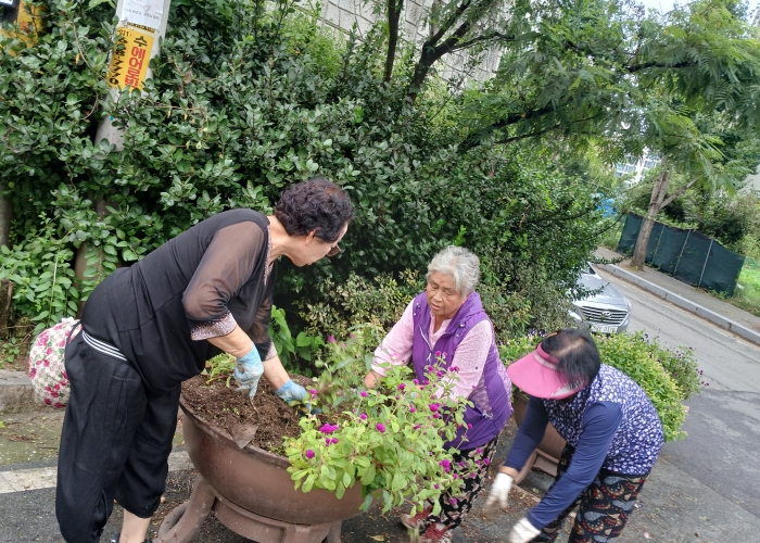 새마을지도자협의회와 부녀회 그리고 행정복지센터 직원 등 20여 명이 참여해 여름에 심었던 꽃과 화단 주변 쓰레기 등을 수거했고, 가을의 정취를 더욱 가까이서 느낄 수 있도록 국화 280본을 심었다.