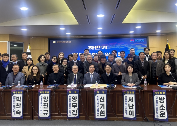 [파이낸셜경제=김예빈 기자] 민주평화통일자문회의 전북지역회의는 12월 10일 전북특별자치도청에서 ‘전환기 남북관계와 한반도 평화체제 구축’을 주제로 2025년 하반기 전북평화통일포럼을 개최했다.
