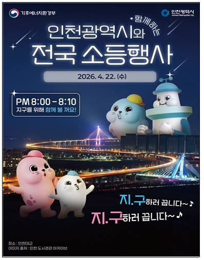 지구의 날 당일인 22일 오후 8시에는 이번 주간의 하이라이트인‘전국 소등 행사’가 열린다. 시청을 비롯한 공공기관과 인천대교, 송도 센트럴파크 등 지역 랜드마크는 물론, 주요 아파트 단지 등 민간 영역까지 참여해 10분간 불을 끄고 지구를 위한 휴식의 시간을 갖는다.