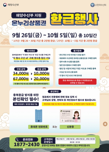 해양수산부와 농림축산식품부가 지원하는 국산 수산물과 농축산물 온누리 상품권 환급행사가 오는 10월 1일부터 5일까지 5일간 진행될 예정이며, 구매금액의 최대 30%를 온누리상품권으로 환급해 준다.