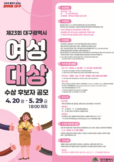 [파이낸셜경제=김지훈 기자] 대구광역시는 여성의 지위 향상과 양성평등 실현에 공헌한 여성 인재를 발굴·격려하기 위해 ‘2026년 제23회 대구광역시 여성대상’ 수상 후보자를 4월 20일부터 5월 29일까지 공개 모집한다.