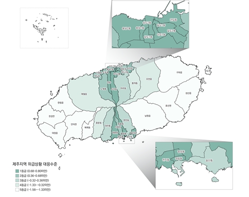 이번 연구에서는 ▲재난·사고 대응을 위한 119출동기관(5분 이내) ▲강력범죄 대응을 위한 112출동기관(5분 이내) ▲응급질환 치료를 위한 응급의료기관(15분 이내)까지의 접근성을 기준으로 '골든타임 서비스 권역'을 설정하고, 이 권역 내에 거주하는 인구 비율을 표준화하여 41개 읍면동(도로 데이터망이 구축되지 않은 추자면, 우도면은 분석 대상에서 제외)의 위급상황 대응수준을 분석했다.