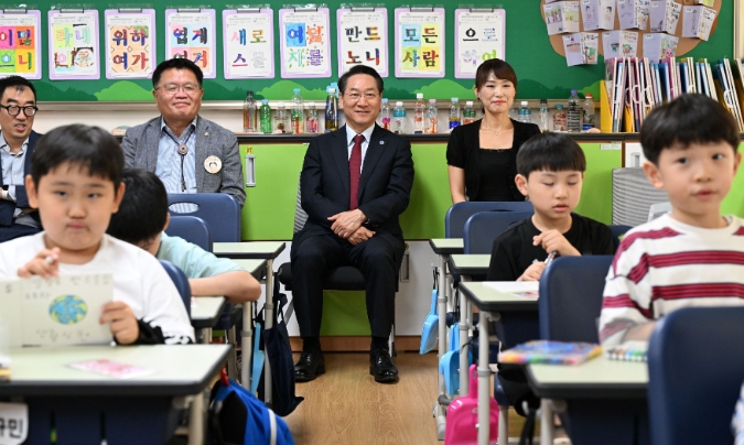 | ▲ 유정복 인천광역시장이 25일 남동구 상아초등학교에서 늘봄프로그램 '지구를 지키는 초록이' 수업을 참관하고 있다. |