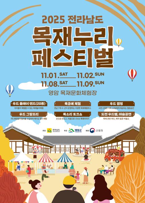 김정섭 전남도 환경산림국장은 “목재누리페스티벌은 목재의 따뜻한 감성과 자연의 소중함을 함께 느낄 수 있는 축제”라며 “가족과 함께 나무 향기 가득한 영암으로 오셔 특별한 가을의 추억을 만들길 바란다”고 말했다.