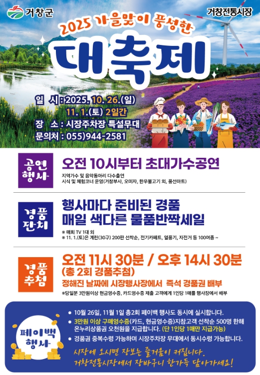특히, 행사 당일 거창전통시장에서 3만 원 이상 물건을 구입한 고객을 대상으로 시장주차장 특설무대에서 TV, 자전거 등 100여 종의 경품 추첨 행사를 진행하며, 온누리 상품권을 지급하는 환급 행사도 함께 운영해 소비자의 혜택을 확대할 계획이다.