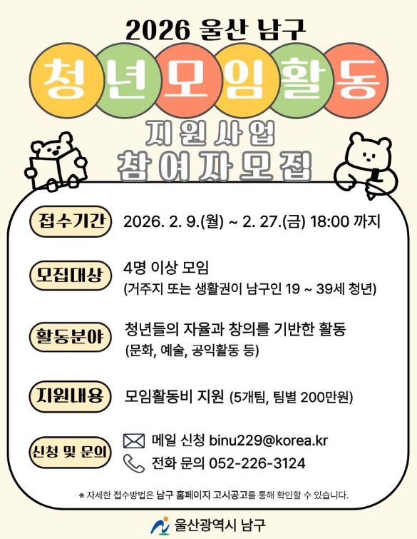 [파이낸셜경제=김예빈 기자] 울산 남구는 2026년 청년모임활동 지원사업인 ‘남구청년, 이모저모’의 참여팀을 모집한다.