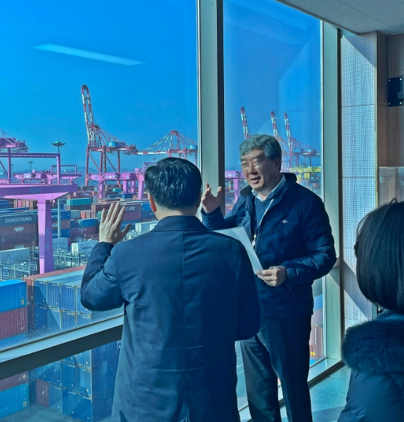 | ▲ - 인천항만공사 이경규 사장이 선광신컨테이너터미널(주) 정국위 대표이사에게 중동사태 이후 컨테이너 터미널 야드 장치율 현황 등을 듣고 있다. |
