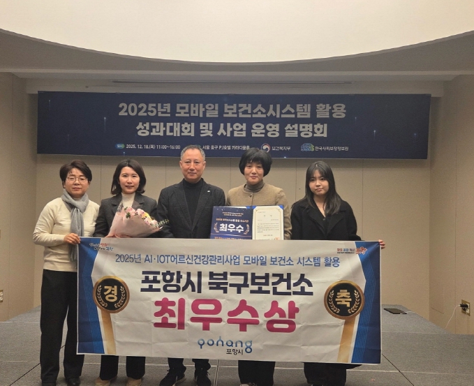 [파이낸셜경제=김지훈 기자] 포항시 북구보건소는 18일 서울 중구 소재의 호텔PJ에서 열린 ‘2025년 AI·IoT 어르신 건강관리사업 모바일 보건소 활용 성과대회’에서 최우수상을 수상했다고 밝혔다.