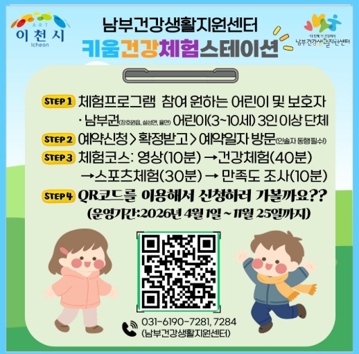 [파이낸셜경제=김기보 기자] 이천시 남부건강생활지원센터는 어린이의 올바른 생활 습관 형성을 위해 체험형 프로그램인 ‘남부 키움건강체험스테이션’을 오는 4월부터 운영한다고 밝혔다.