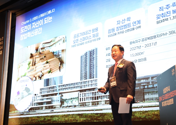 행사는 김영록 벤처기업협회 부회장의 기조강연으로 시작됐다. 이어 주광덕 남양주시장이 직접 왕숙 도첨산단의 투자 강점을 설명했다.