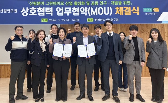 [파이낸셜경제=김예빈 기자] 전라남도산림연구원이 25일 ㈜현대바이오랜드와 산림자원을 활용한 그린바이오 산업 활성화를 위해 업무협약을 하고, 고부가가치 제품 개발과 원물의 안정적 생산체계 구축을 위한 상호 협력에 나섰다.