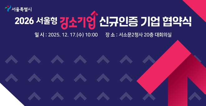 서울시는 지난 9월 ‘2026년 서울형 강소기업’으로 신규 인증한 48개사와 청년 정규직 채용 확대 및 일·생활 균형이 가능한 근무환경 조성을 약속하는 '2026년 서울형 강소기업 신규 인증 협약식'을 12월 17일(수) 서울시청 서소문2청사에서 개최했다고 밝혔다.