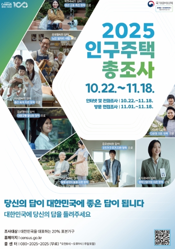 인구주택총조사는 5년마다 실시하는 전국 규모 통계조사로, 대한민국에 거주하는 모든 인구와 주택을 조사해 국가 및 지역정책 수립의 기초자료로 활용된다.