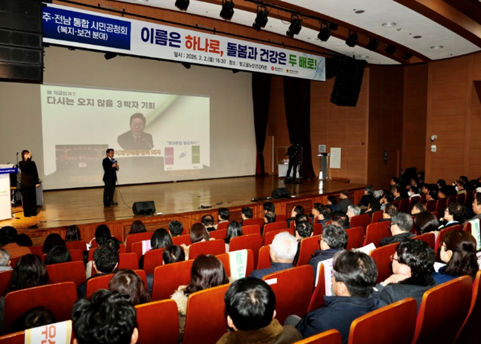 [파이낸셜경제=김예빈 기자] 광주광역시는 2일 빛고을노인건강타운에서 ‘광주전남 통합 복지·보건·의료 분야 시민공청회’를 개최, 광주전남 통합으로 광주가 시작한 통합돌봄 등을 더 두텁게 보장할 수 있는 방안 등을 논의했다.
